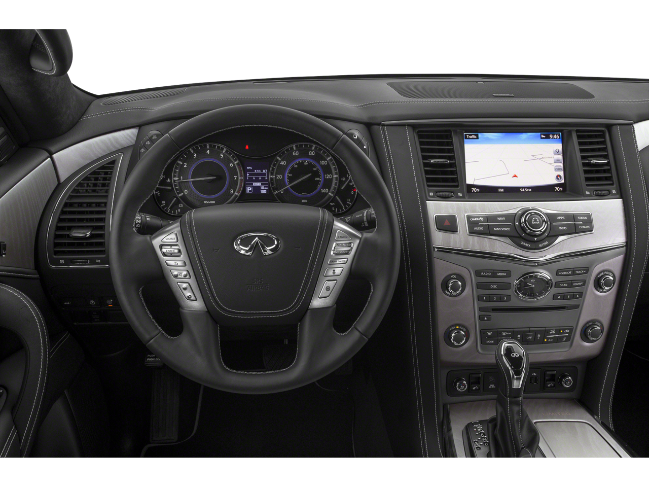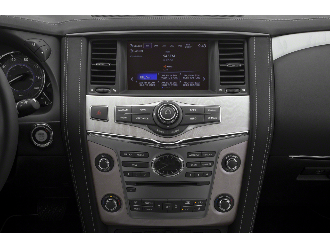 - Radio: AM/FM/HD w/Single In-Dash CD/DVD Player & MP3 -inc: Bose Cabin Surround sound system w/digital 5.1-decoding, 15-speakers, INFINITI controller w/8-inch touch-screen display, INFINITI InTouch navigation w/voice recognition, lane guidance and 3D building graphics, INFINITI InTouch services includes 12-months of safety, security and convenience services, streaming audio via Bluetooth® wireless technology, Bluetooth® hands-free phone system, hands-free text messaging assistant, Radio Data System (RDS), speed-sensitive volume control, driver's audio stage, SiriusXM radio w/90-day complimentary trial, SiriusXM Traffic w/4-year complimentary trial access to real-time traffic information, SiriusXM Travel Link w/4-year complimentary trial access to weather, fuel prices, stocks, sports and movie times and 2 first row USB connection ports for iPod interface and other compatible devices