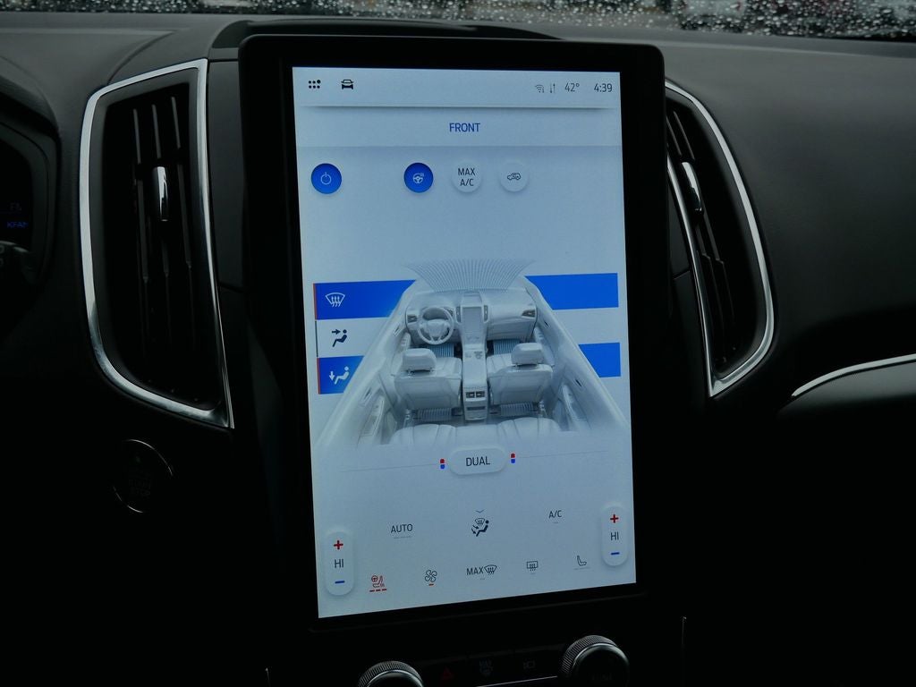 The interior of the Edge Titanium is a sanctuary of comfort and refinement. Indulge in the luxurious ActiveX-trimmed heated sport bucket seats, which offer both style and support. The Panoramic Vista Roof floods the cabin with natural light, creating a spacious and airy atmosphere. Stay connected with the advanced SYNC 4A infotainment system, featuring enhanced voice recognition and a premium B&O sound system.